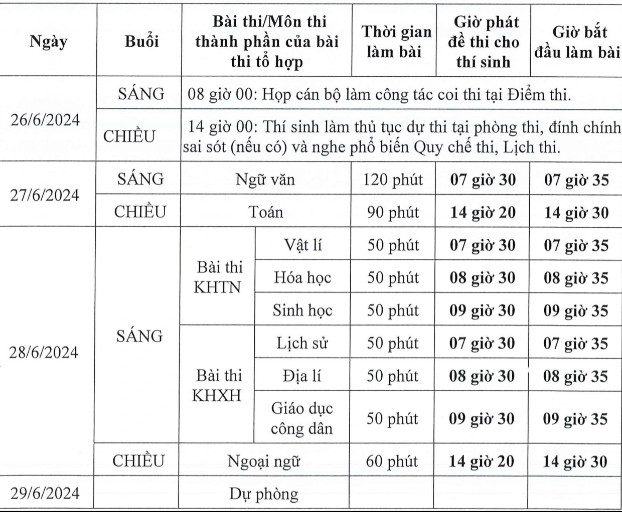 Cụ thể, kỳ thi tốt nghiệp trung học phổ thông (THPT) năm 2024 được tổ chức vào các ngày 26, 27, 28, 29/6 tới. Trong đó: Ngày 26/6: làm thủ tục dự thi; ngày 27- 28/6: tổ chức coi thi; ngày 29/6: dự phòng.
