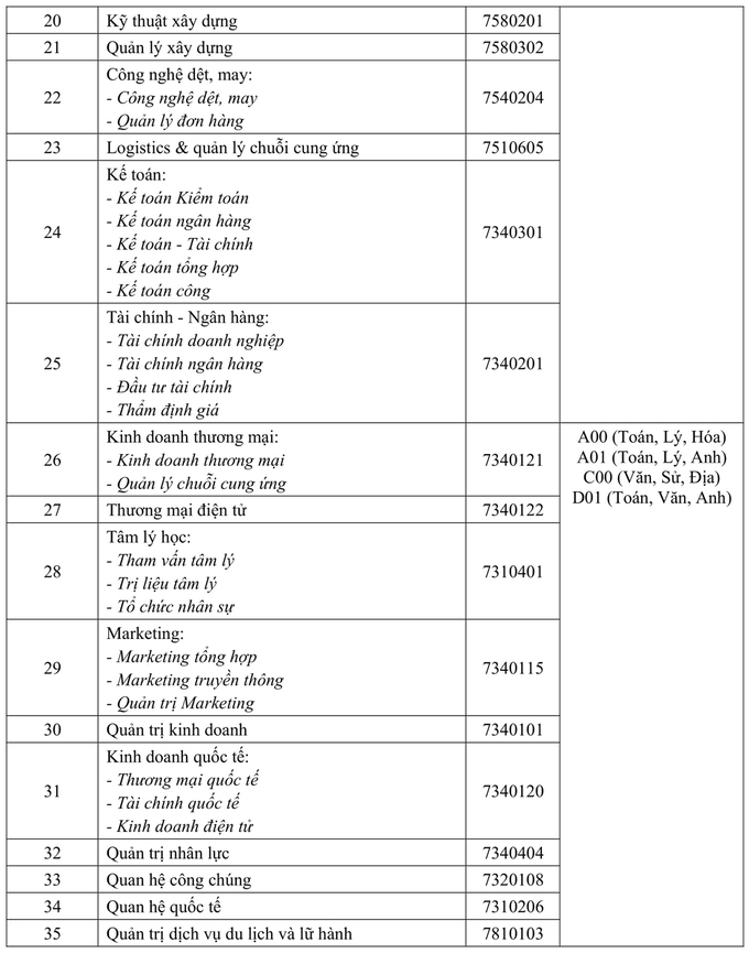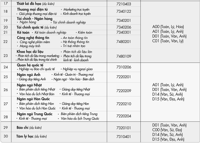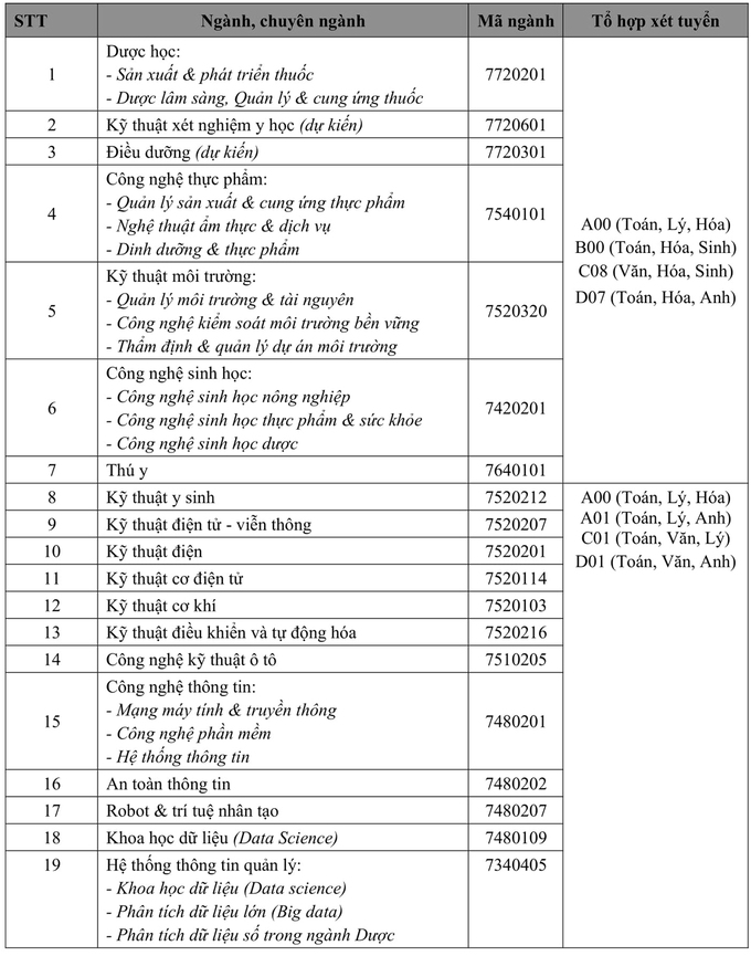 Ngoài 58 ngành học trong mùa tuyển sinh cũ, trường dự kiến mở 6 ngành: Robot và hệ thống điều khiển thông minh, Quản lý đô thị thông minh và bền vững, Kỹ thuật hóa phân tích, Kinh tế tài nguyên thiên nhiên, Quản trị nguồn nhân lực, Logistics và quản lý chuỗi cung ứng.