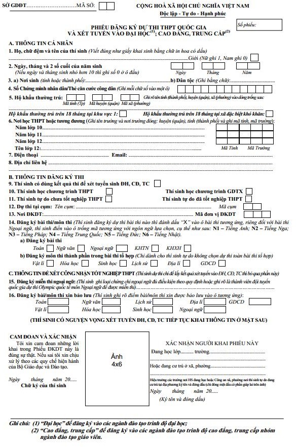Mẫu Phiếu Đăng Ký Dự Thi THPT Quốc Gia 2020